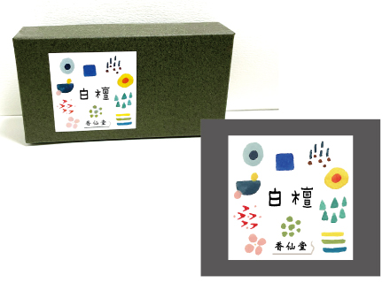 白檀のパッケージラベルを描かせていただきました。香仙堂は昭和4年創業 日本で初めてラベンダーのお線香を発売。化学物質を使用せず天然成分だけで作るお線香は病気の方でも使えると親しまれています。